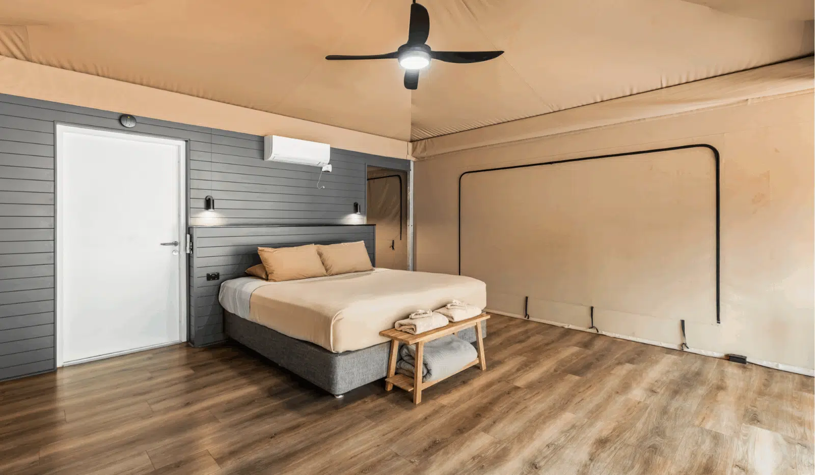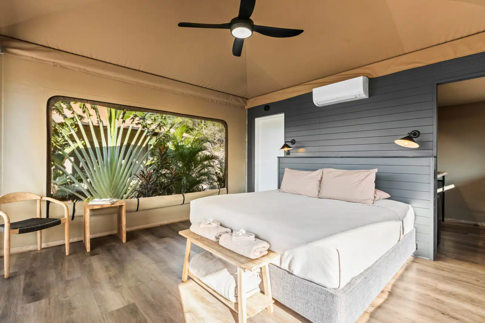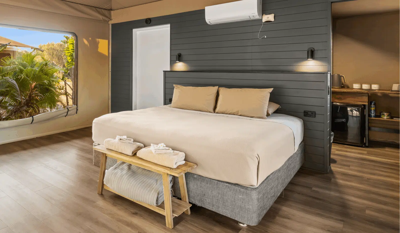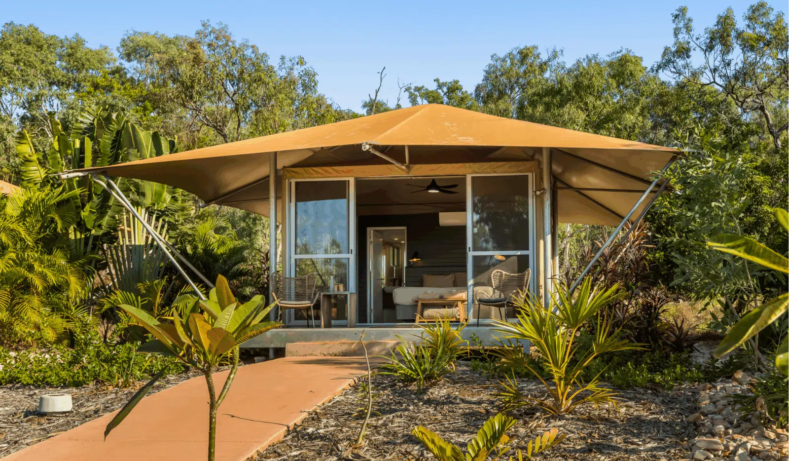These deluxe family glamping eco tents bring a new level of luxury with private ensuite, air-conditioning, king size bed and bunk-beds. Built to be eco-friendly with minimal impact on our environment. We have used 100% local businesses for the entire production including indigenous trade and furniture items made in Broome by Aguyna, a not-for-profit community organisation. Surrounded by hundreds of locally grown plants, this serene space is an easy walking distance to the pool and restaurant.