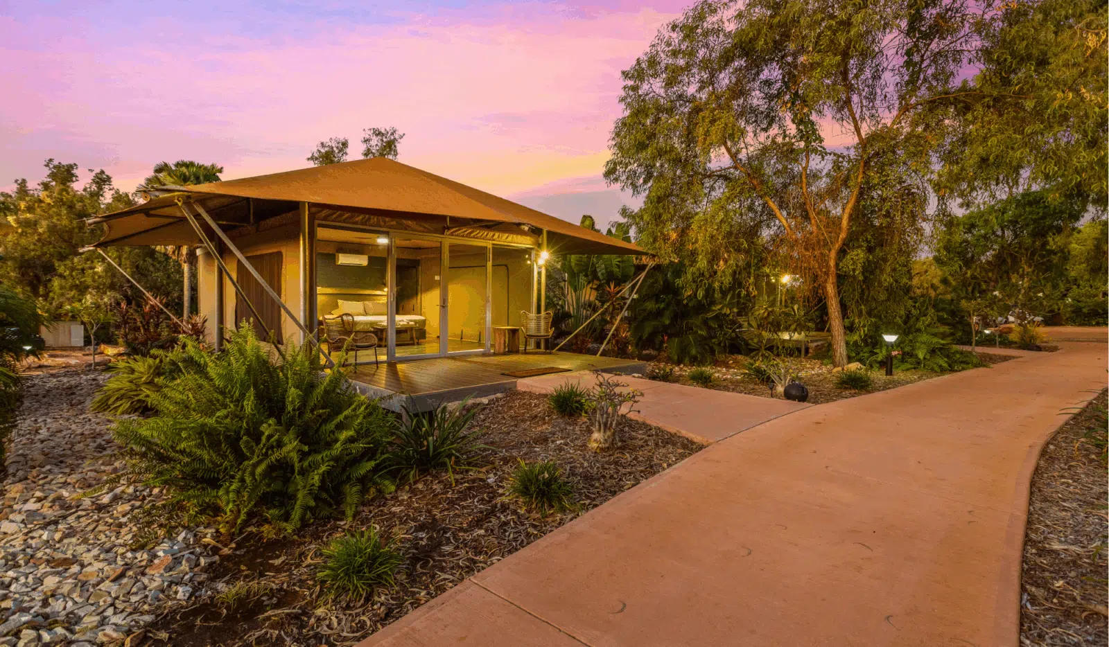 These deluxe glamping eco tents bring a new level of luxury with private ensuite, air-conditioning and king size beds. Built to be eco-friendly with minimal impact on our environment. We have used 100% local businesses for the entire production including indigenous trade and furniture items made in Broome by Aguyna, a not-for-profit community organisation. Surrounded by hundreds of locally grown plants, this serene space is an easy walking distance to the pool and restaurant. Wheelchair accessible tents available.
