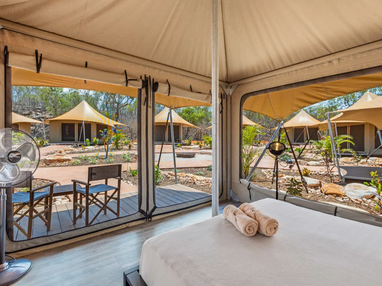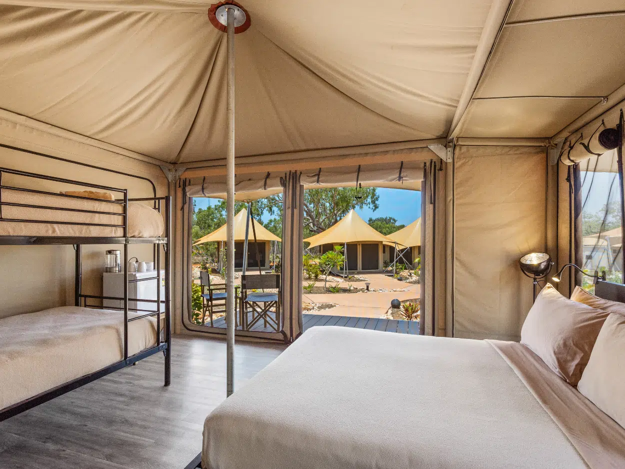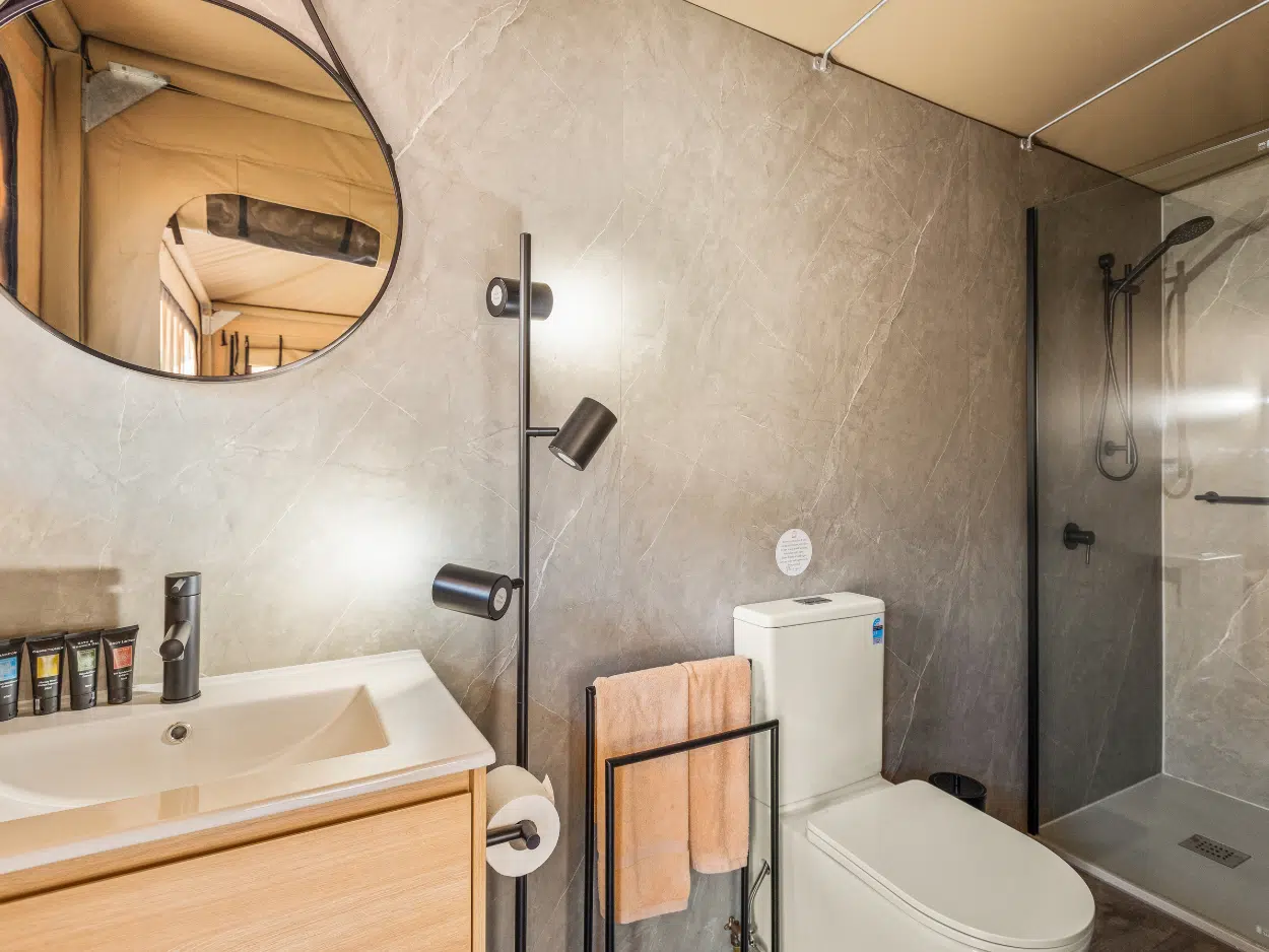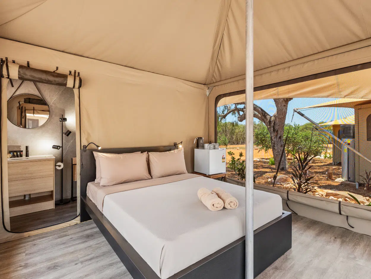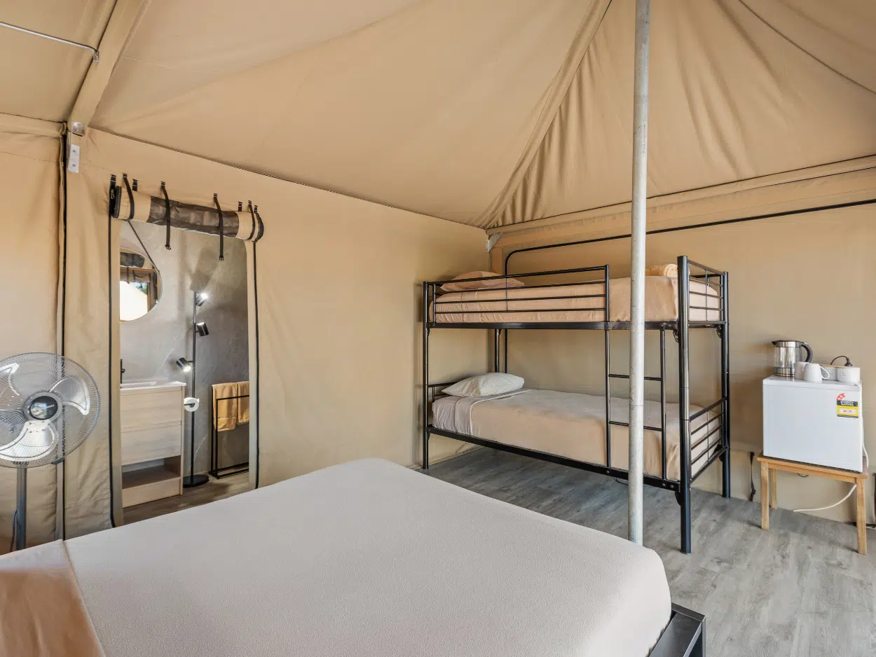 For families seeking a memorable getaway, our Family Village Eco Tents are the perfect choice. With the comfort of a private ensuite, a queen size bed, fans and a bunk bed, there's plenty of space for everyone to unwind. Experience the convenience of being just steps away from our main village attraction, while still enjoying the serenity of nature. Linen and bathroom towels provided for your convenience.